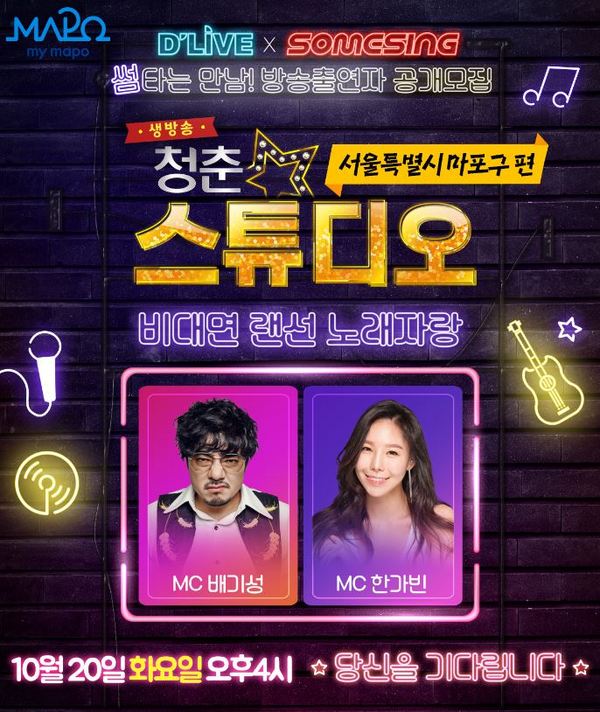 올해 상반기에 이어 두 번째로 진행되는 이번 “D’LIVE 청춘스튜디오”는 ‘마포구 지역상인 코로나19 극복 프로젝트’의 일환으로, 코로나19로 인해 지쳐가는 지역상인과 구민들에게 위로와 희망을 전달하기 위해 마련됐다.