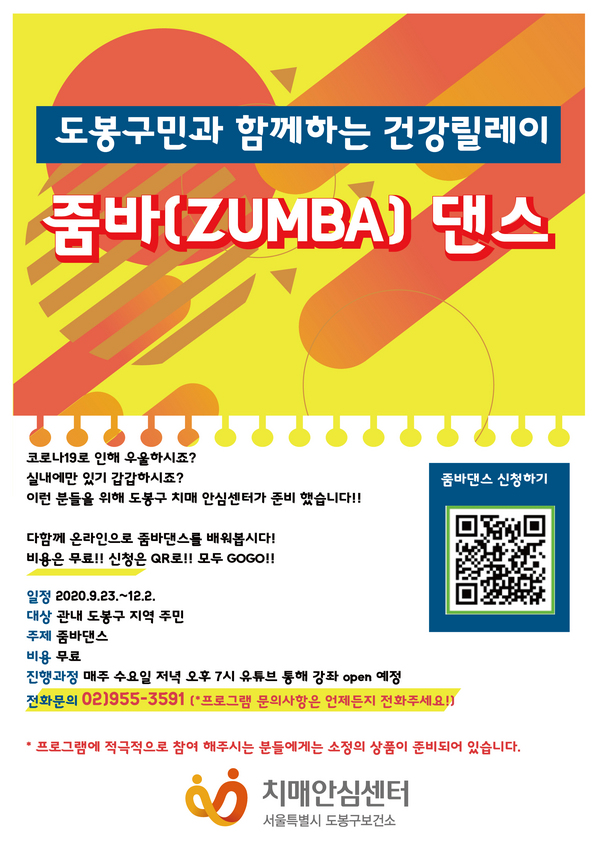 도봉구는 치매안심센터는 코로나19로 인한 사회 활동 단절로 갑갑한 일상을 보내고 있는 지역주민들의 활력을 되찾기 위해 유튜브 건강강좌 ‘도봉구민과 함께하는 건강릴레이-줌바(ZUMBA) 댄스’를 12월 2일까지 운영한다.