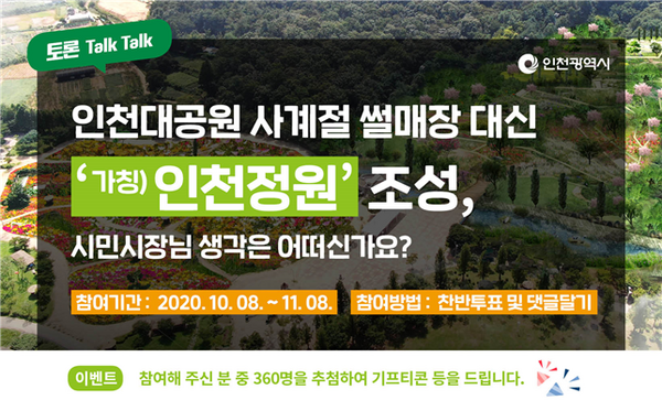 시는 토론 Talk Talk을 통해 썰매장이 위치한 관모산 사면부지를 활용하여 ‘가칭)인천정원’을 조성하는 것에 대한 시민의견을 수렴한 후, 향후 인천대공원 이용 활성화 등을 위한 정책 수립에 활용한다는 방침이다.