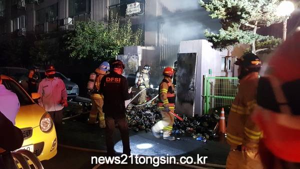 (대구=뉴스21통신) 유재원기자 = 2020년10월9일 20시50분경 대구 북구 침산동에 위치한 제일아파트 재활용 수거장에서 10여차례 정도의 폭발음과 동시에 화재가 발생하였다.