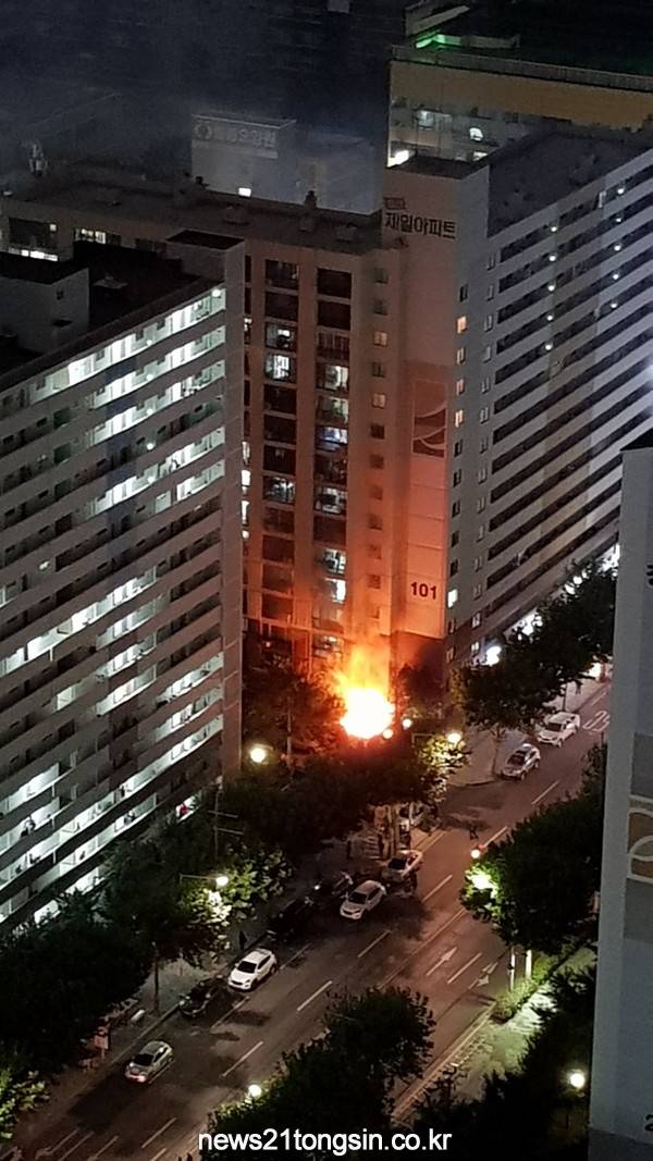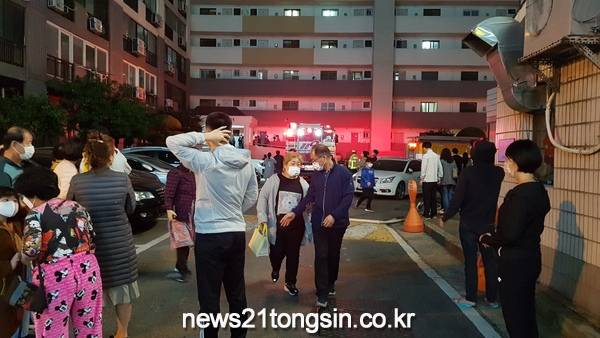 ▲ 폭발음과 불길에 아파트 주민을 비롯한 주변 상가들은 걱정스러운 마음으로 뛰처나와 상황을 살피고 있다.(사진=뉴스21통신 유재원기자)