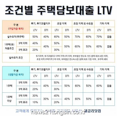 이에 주택담보대출 금리 비교 사이트 ‘내금리닷컴’은 규제 지역과 대출 목적에 따라 달라지는 LTV 조건과 한도를 8일 소개했다.