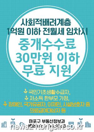 무료중개 지원사업의 지원대상자는 마포구 부동산정보과 또는 주민등록상 거주지 동주민센터를 통해 무료지원을 신청할 수 있다. 기타 자세한 사항은 부동산정보과(02-3153-9533)로 문의하면 된다.