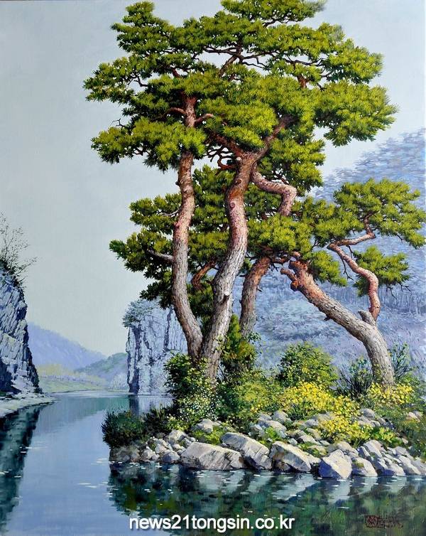자연을 대상으로 색채와 선의 아름다움을 사실적인 풍경으로 재현한 작가 김영철은 소나무의 상징화된 이미지와 시각적 풍경들을 교차하듯 선보인다.