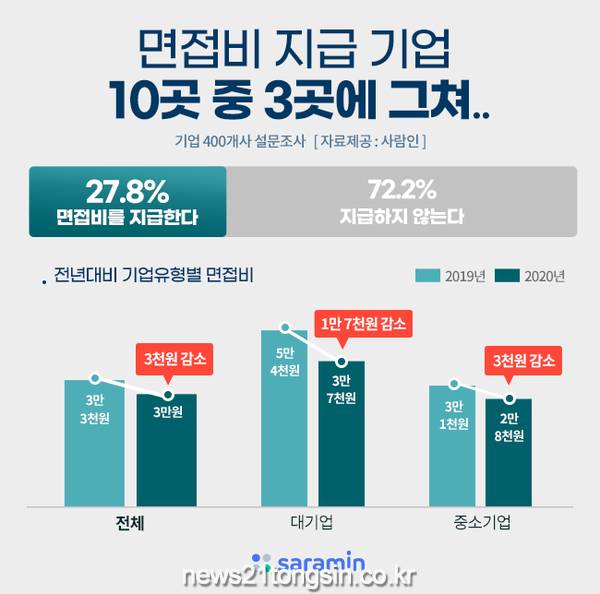 면접자에게 제공하는 면접비는 평균 3만원으로 집계돼, 지난해 조사 결과인 3만 3천원 보다도 3천원 적었다.