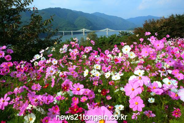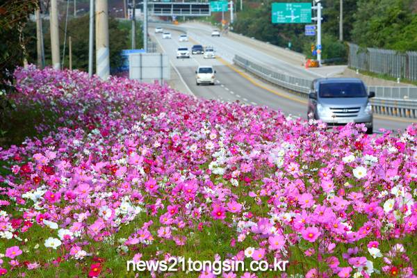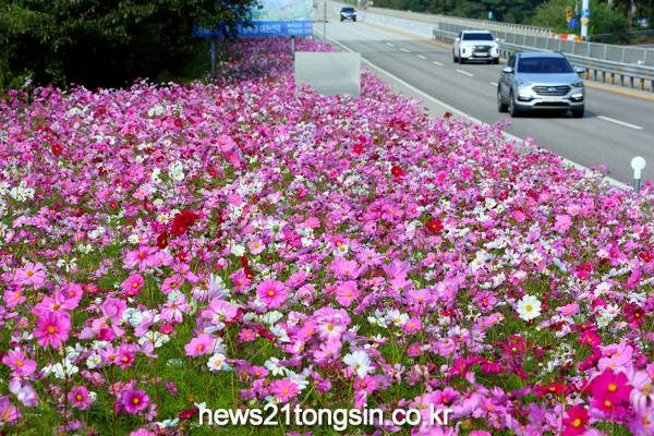 이를 위해 군은 지난 5월과 6월경부터 파종을 시작하고 7월 말 식재해, 올해 개화시기를 이달 중순부터 코스모스가 만개할 수 있도록 꽃길을 조성해 주요 도로 곳곳이 한들한들 코스모스로 장관을 이루고 있다.