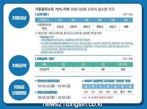 이번 지원은 정부의 2차 맞춤형 긴급생계지원금으로 지원 대상은 코로나19로 인해 가구소득이 25%이상 감소하고, 가구원 전체 소득의 합이 기준 중위소득의 75% 이하이며, 재산이 6억 원 이하인 가구다.