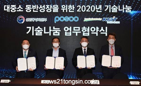 전날인 14일 개최된 ‘포스코 기술나눔 업무협약’행사에는 산업통상자원부 장영진 산업기술융합정책관, 한국산업기술진흥원(KIAT) 석영철 원장, 포스코 천시열 생산기술전략실장과 수혜 중소기업 대표들이 참석했다. 이날 행사는 코로나19의 확산 방지를 위해 참석 인원을 줄이고 온라인으로도 생중계됐다.