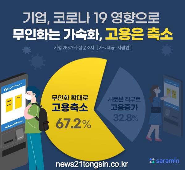 사람인 임민욱 팀장은 “코로나19로 인해 모든 분야에서 디지털화가 급속하게 진행되면서 무인화 시대는 이제 피할 수 없는 필연적인 결과가 됐다”며 “이로 인해 고용이 축소되는 산업도 있고, 반대로 성장을 하게 되는 분야도 있기 때문에 변화의 충격이 크지 않도록 각 기업들의 대비책 마련은 물론 사회적 안전망이나 정책 연구 등 정부 차원의 대비도 필요하다”고 말했다.