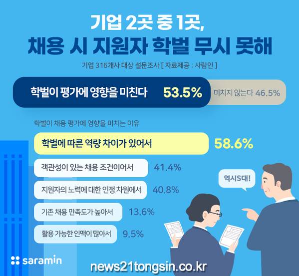 구인구직 매칭 플랫폼 사람인(www.saramin.co.kr, 대표 김용환)이 기업 316개사를 대상으로 ‘학벌이 채용 평가에 영향을 미치는지 여부’를 조사한 결과, 절반 이상인 53.5%가 ‘영향을 미친다’고 답했다. 이는 지난해 조사(48.1%) 대비 오히려 5.4%p 상승한 수치다.