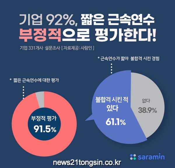 구인구직 매칭 플랫폼 사람인(www.saramin.co.kr 대표 김용환)이 기업 인사담당자 331명을 대상으로 ‘짧은 근속연수 평가’에 대해 조사한 결과, 91.5%가 ‘부정적으로 평가한다’고 답했다.
