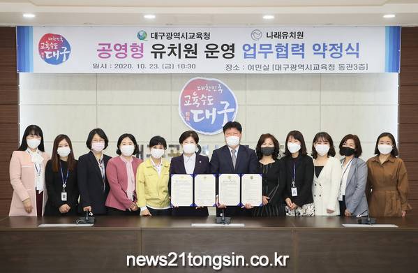 (대구=뉴스21통신) 유재원기자 = 대구시교육청은 10월 23일(금) 오전 10시 30분 시교육청 여민실에서 투명하고 건전한 유치원 운영을 위해 사립 나래유치원(달서구 이곡동)과 ‘공영형 유치원 업무협력 약정’을 체결한다.