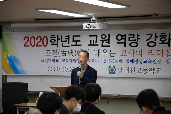 남대전고등학교(교장 조기한)는 지난 10월 23일(금) 교내 직원회의실에서 전체 교직원을 대상으로 김병조 조선대학교 특임교수 및 동대학명예평생교육원장을 모시고 고전(古典)에서 배우는 교사의 리더십이란 주제를 갖고 2020 교원 역량 강화 연수를 실시했다고 밝혔다.