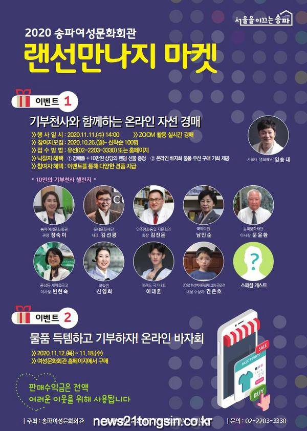 이번 온라인 경매 및 바자회는 ‘랜선만나지 마켓’으로 송파여성문화회관과 함께 한다. 코로나 시대에 맞춰 온라인 상에서 만나 나눔을 실천한다는 의미를 담아 행사명을 지었다.
