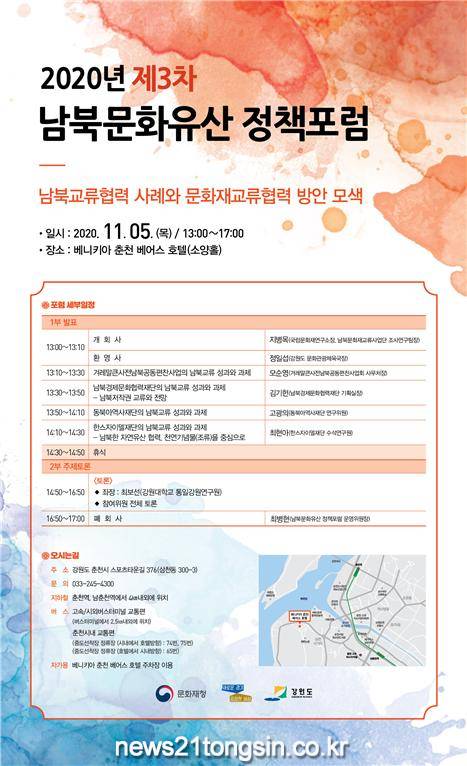 문화재청(청장 정재숙)·강원도(최문순 지사)·경기도(이재명 지사)는 2020년 제3차 남북문화유산 정책포럼을 5일 베니키아 춘천 베어스 호텔에서 개최한다.
