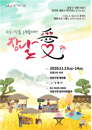신종 코로나바이러스 감염증(코로나19)으로 인한 경기침체와 상권변화로 전통시장이 어려움을 겪고 있다. 이에 강동구(구청장 이정훈)는 전통시장에 활력을 불어넣고, 상인과 지역주민이 함께 어울려 소통하고 휴식할 수 있는 시간을 마련하고자 2020. 강동구 전통시장 한마당! '장날 愛'행사를 개최한다.