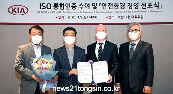 기아자동차가 국내 자동차 업계 최초로 취득한 『ISO 통합인증』은 ▲사업장에서 발생할 수 있는 각종 위험을 선제적 예방하고 조직의 안전보건을 체계적으로 관리하기 위한 국제표준인 ‘ISO 45001(안전보건)’ ▲환경사고 사전 예방을 통해 쾌적한 사업장과 지역사회를 구축하고 환경 위험성을 효율적으로 관리할 수 있는 국제표준인 ‘ISO 14001(환경)’의 두 경영시스템을 아우르고 있으며, 분야(안전보건·환경)와 지역(본사·국내공장)을 통합하는 인증이라는 점에서 의의가 크다.