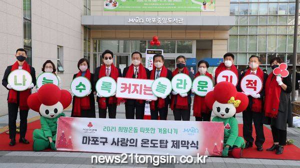 마포구(구청장 유동균)가 11일 오후 마포중앙도서관 광장에서 「2021 따뜻한 겨울나기」 사업 홍보를 위한 ‘사랑의 온도탑’ 제막식을 개최했다.