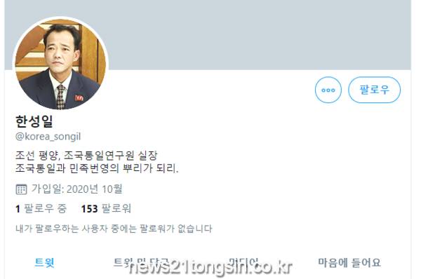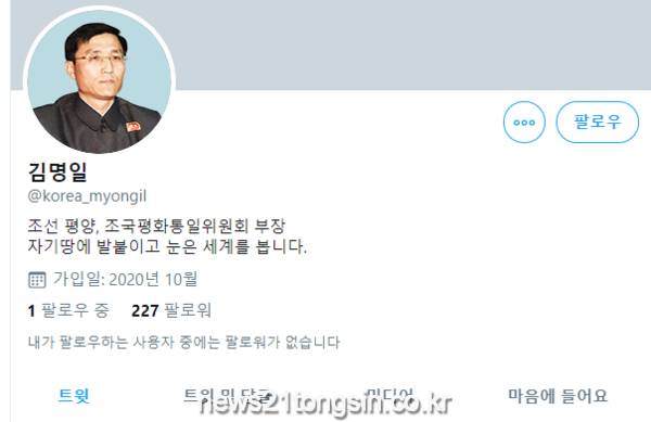 북한주민 개인 명의를 내세운 트위터 계정이 등장했다. 자신을 김명일 조국평화통일위원회 부장, 한성일 조국통일연구원 실장이라고 소개한 트위터 계정 2개가 13일 확인됐다.
