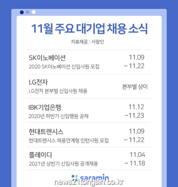 SK이노베이션, LG전자 등 주요 대기업의 하반기 막바지 채용 소식이 이어지면서 구직자들의 관심이 쏠리고 있다. 이에 구인구직 매칭플랫폼 사람인(www.saramin.co.kr, 대표 김용환)이 11월 진행하는 주요 대기업의 채용 소식을 정리했다.