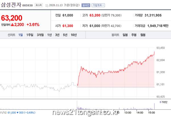13일 유가증권시장에서 삼성전자 보통주 주가는 전일 대비 3.61% 올라 6만3200원을 기록했다. 지난 1월 20일 이후 최고치다.