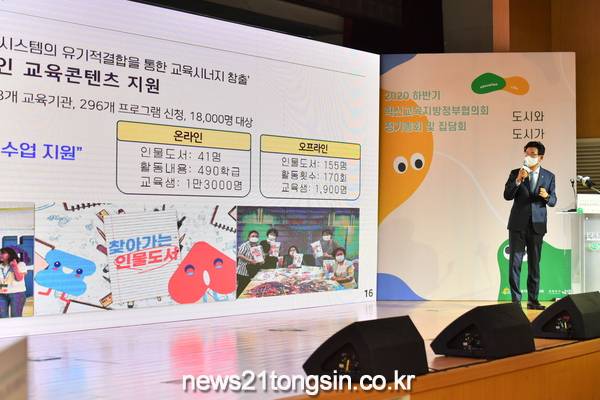 이날 정기총회는 유은혜 교육부장관, 대통령직속 기관인 국가교육회의 김진경 의장을 비롯해 각 권역별 대표도시 단체장 등 30여 명이 참석했다. 코로나19 등으로 변화하고 있는 교육환경에서 지자체와 학교 간 협력모델에 대한 의견을 나눴다.