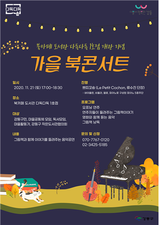 아울러, 가을 북콘서트는 코로나19 방역수칙을 준수하여 진행되며, 사전신청 접수 후 참여가능하다. 문의 및 접수는 북카페도서관 다독다독(☎070-7767-0120)으로 하면 된다.