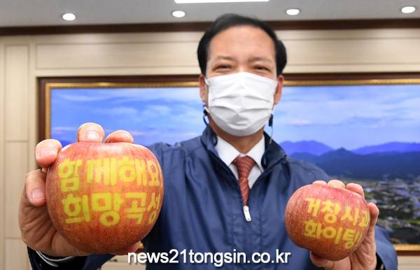 19일 거창군에 따르면 자매도시 곡성군에서 거창군을 상징하는 문구를 곡성사과에 새겨 생산한 문자사과를 보내왔다고 전했다.