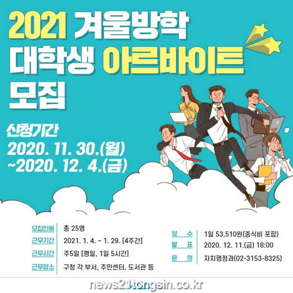 마포구(구청장 유동균)가 지역 내 대학생을 대상으로 2021년 1월 4일부터 1월 29일까지 4주간 운영하는 겨울방학 대학생 아르바이트에 참여할 학생을 오는 11월 30일부터 모집한다고 밝혔다.