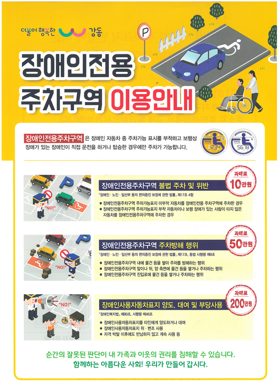 위반 시에는 장애인전용주차구역 불법주정차 10만 원, 주차방해 행위 50만 원, 장애인사용자동차표지 위‧변조 등 부당사용 시 200만 원의 과태료가 부과된다.