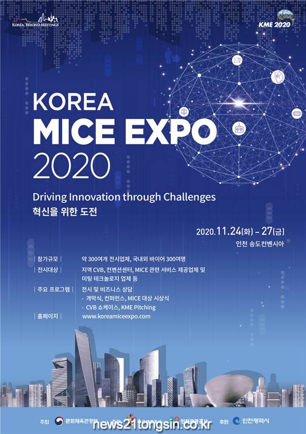 인천광역시(시장 박남춘)는 문화체육관광부, 한국관광공사, 인천관광공사와 함께 ‘2020 코리아 마이스 엑스포(KOREA MICE EXPO 2020, 이하 KME 2020)’를 11월 24일부터 27일까지 송도컨벤시아에서 개최한다고 밝혔다.