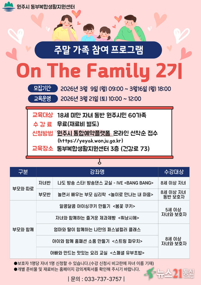 원주시 동부복합생활지원센터는 오는 21일 주말 가족 참여 프로그램 ‘온 더 패밀리(On The Family)’ 2기 과정을 운영한다.이번 과정은 가족이 서로의 소중함을 느끼고 소통하는 시간을 가질 수 있도록 마련됐으며, 다양하고 풍성한 가족 프로그램이 준비돼 있다.2기 프로그램은 ▲자녀와 함께하는 즐거운 제과제빵 ▲아빠와 만드는 맛있.