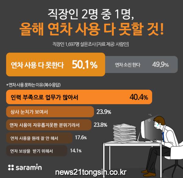 연차 사용을 못하는 이유 1위로는 ‘인력부족으로 업무가 많아서’(40.4%, 복수응답)가 꼽혔으며, ‘상사 눈치가 보여서’(23.9%), ‘연차 사용이 자유롭지 못한 분위기여서’(23.8%)가 뒤를 이었다. 그 밖에 ‘연차 사용을 원래 잘 하지 않아서’(17.6%), ‘연차 보상을 받기 위해서’(14.1%), ‘코로나19로 회사 상황이 악화돼서’(11.1%)의 의견이 있었다.