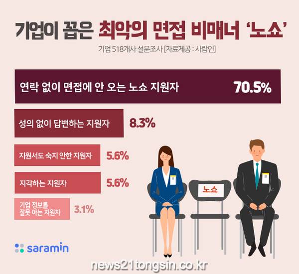 구인구직 매칭플랫폼 사람인(www.saramin.co.kr, 대표 김용환)이 기업 518개사를 대상으로 ‘최악의 면접 비매너’를 조사한 결과, ‘연락 없이 면접에 안 오는 노쇼 지원자’가 70.5%로 1위였다.