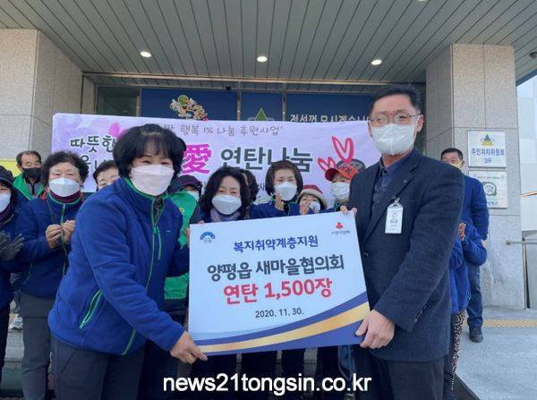 양평읍 남녀 새마을회 회원들은 “겨울철 경제적 부담으로 인해, 난방비를 아끼려 연탄 사용을 어려워하시는 분들이 많이 있다고 알고 있다며, 이러한 분들이 풍족하진 않겠지만 조금이나마 따뜻한 겨울을 보냈으면 좋겠다는 뜻에서 기부를 진행하였다.”고 전했다.