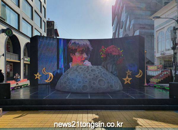 대형 LED화면에는 우주를 형상화한 배경화면을 비롯해 BTS의 공연영상 등이 상영되고 있어 홍대를 찾는 세계 관광객의 눈길을 사로잡을 것으로 예상된다.