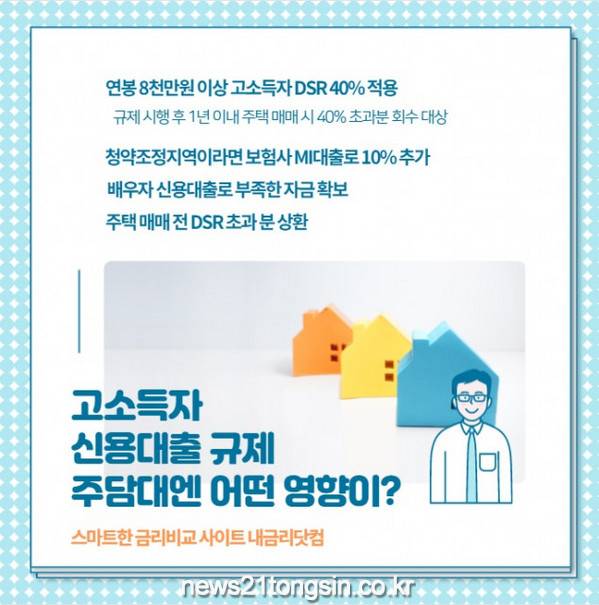 하지만 이번 규제 강화 후 연봉 8000만원이 넘는 고소득자가 1억 원을 초과하는 신용 대출을 받을 때도 DSR 40% 기준을 적용한다.