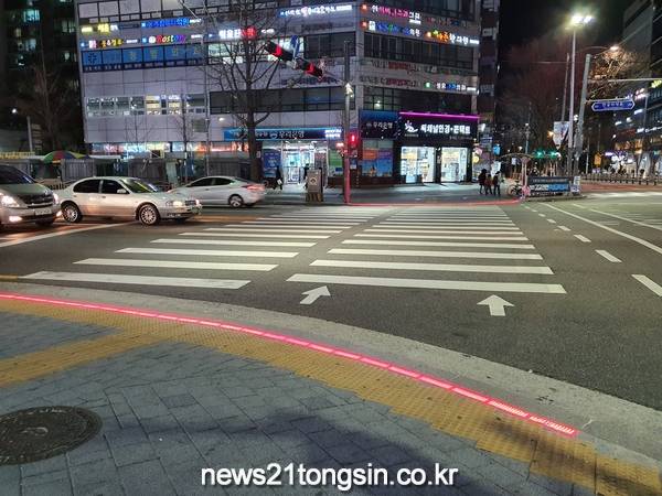 「신개념의 교통 시설물」은 LED 바닥 신호등과 자동 음성 안내장치로 최근 3년간 발생한 교통사고를 분석해 횡단 중 교통 사고율이 54%로 절반 이상을 차지한 곳을 대상으로 했다.