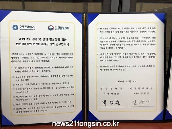 인천광역시는 인천본부세관(김윤식)과 상호 유기적인 협력체계 구축으로 코로나19 극복 및 지역경제 활성화를 위한 업무협약을 체결했다고 밝혔다.