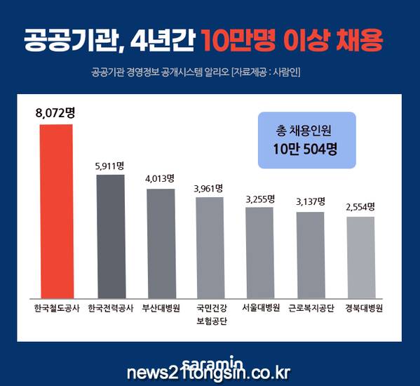4년동안 가장 많은 정규직 신규채용을 진행한 상위 10개 공공기관은 ▲한국철도공사(8,072명, 2017년~2020년 3분기 누적)였다. 이어 ▲한국전력공사(5,911명), ▲부산대학교병원(4,013명), ▲국민건강보험공단(3,961명), ▲서울대학교병원(3,255명), ▲근로복지공단(3,137명), ▲경북대학교병원(2,554명), ▲한국보훈복지의료공단(2,413명), ▲경상대학교병원(2,268명), ▲전남대학교병원(2,226명) 이었다. 다수의 채용을 진행하는 분야는 주로 보건•복지/의료 분야로, 2017년부터 상당히 대규모의 신규 정규직 채용을 진행해왔다.