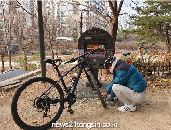서울 노원구(구청장 오승록)가 자전거 이용 활성화를 위해 자동식 자전거 공기주입기를 설치했다고 밝혔다.