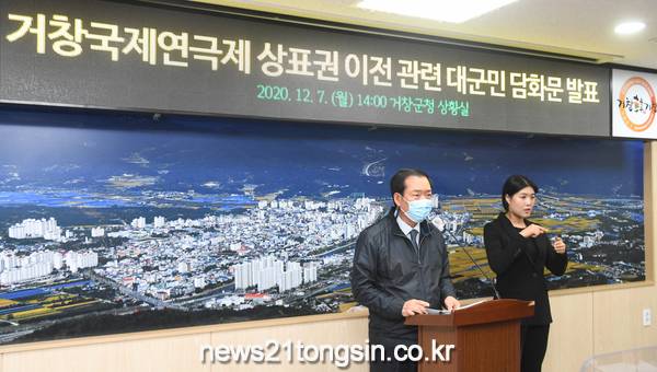 거창군은 7일 군청 상황실에서 거창국제연극제 상표권 이전 관련 대군민 담화문을 발표했다. 그간 분쟁의 대상이었던 연극제 상표권을 10억원에 이전받기로 거창국제연극제 집행위원회(이하 집행위)와 지난 4일 합의서를 체결하고, 집행위는 관련 소를 취하했다고 밝혔다.