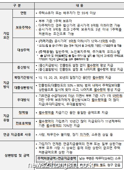한국주택금융공사(HF, 사장 이정환)는 ‘한국주택금융공사법’ 개정안이 지난 12월 1일 국무회의 의결을 거쳐 12월 8일 공포됨에 따라 주택연금의 가입 문턱을 낮추는 가격기준 완화(시가 9억원 → 공시가격 9억원)와 가입대상 주택에 주거목적 오피스텔을 포함하는 공사법 개정사항을 공포 후 즉시 시행한다고 밝혔다.
