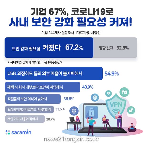구인구직 매칭 플랫폼 사람인(www.saramin.co.kr 대표 김용환)이 기업 244개사를 대상으로 ‘코로나19와 사내 보안’에 대해서 설문한 결과, 67.2%가 사내 보안 강화 필요성이 커졌다고 답했다.