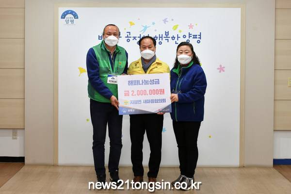 양평군이 지난 9일 지평면 새마을협의회(협의회장 이진수)가 ‘상부상조 정신을 바탕으로 지역 사회 발전을 도모하고 공익적 봉사 활동을 통하여 건강한 사회를 이루자’는 설립 취지에 맞춰 양평군에 해피나눔성금으로 2백만원을 기탁했다.