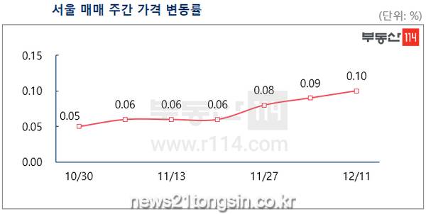 부동산114의 주간 아파트 동향에 따르면 이번주 서울 아파트 매매가격은 0.10% 올라 3주 연속 상승폭이 확대됐다. 재건축 아파트는 0.11%, 일반 아파트는 0.10% 올랐다. 경기ㆍ인천과 신도시도 각각 0.10%, 0.17% 올라 상승폭이 커졌다. 수도권 전세시장은 서울이 0.19% 상승했고 경기ㆍ인천과 신도시는 각각 0.11%, 0.17% 올랐다.