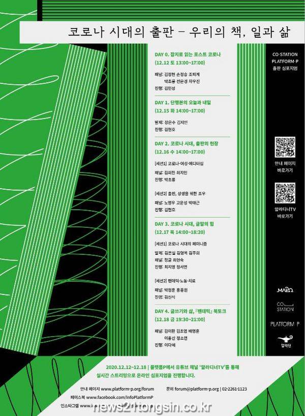 심포지엄 행사 장면은 인터넷서점 알라딘이 운영하는 유튜브 채널 ‘알라디너TV’를 통해 실시간 송출된다. 심포지엄 안내 및 사전신청은 플랫폼P 온라인 누리집에서 하면 된다.