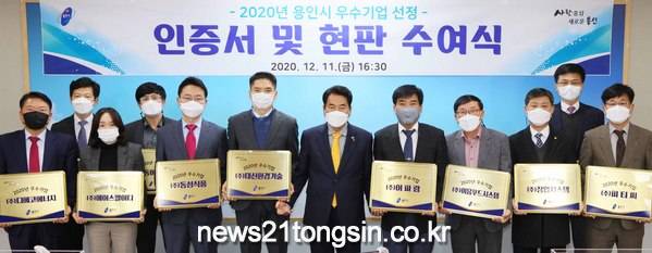 용인시는 11일 올해 지역 경제 발전에 앞장서 온 11개 중소기업을 ‘2020년 용인시 우수기업’으로 선정해 인증서와 현판을 전달했다고 밝혔다.