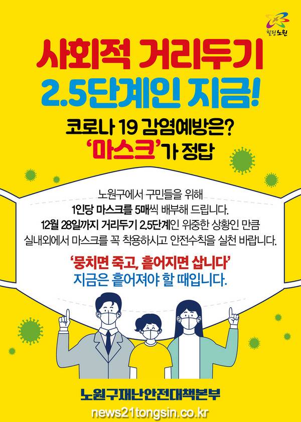 이번 마스크 배부는 수도권 사회적 거리두기가 2.5단계로 격상되고 코로나19 3차 대유행의 단계로 들어선 심각한 위기상황에서 코로나 확산을 차단하고, 구민의 안전과 건강을 지키기 위한 선제적 방역 조치다.