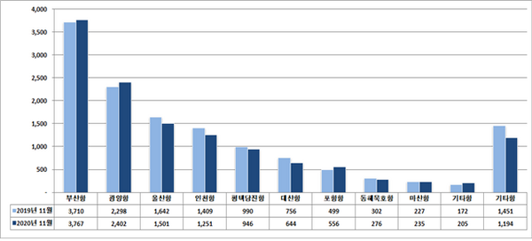 지난 11월 전국 무역항에서 처리한 항만 물동량이 총 1억 2,977만 톤으로 전년 동월(1억 3,456만톤) 대비 3.6% 감소했다.